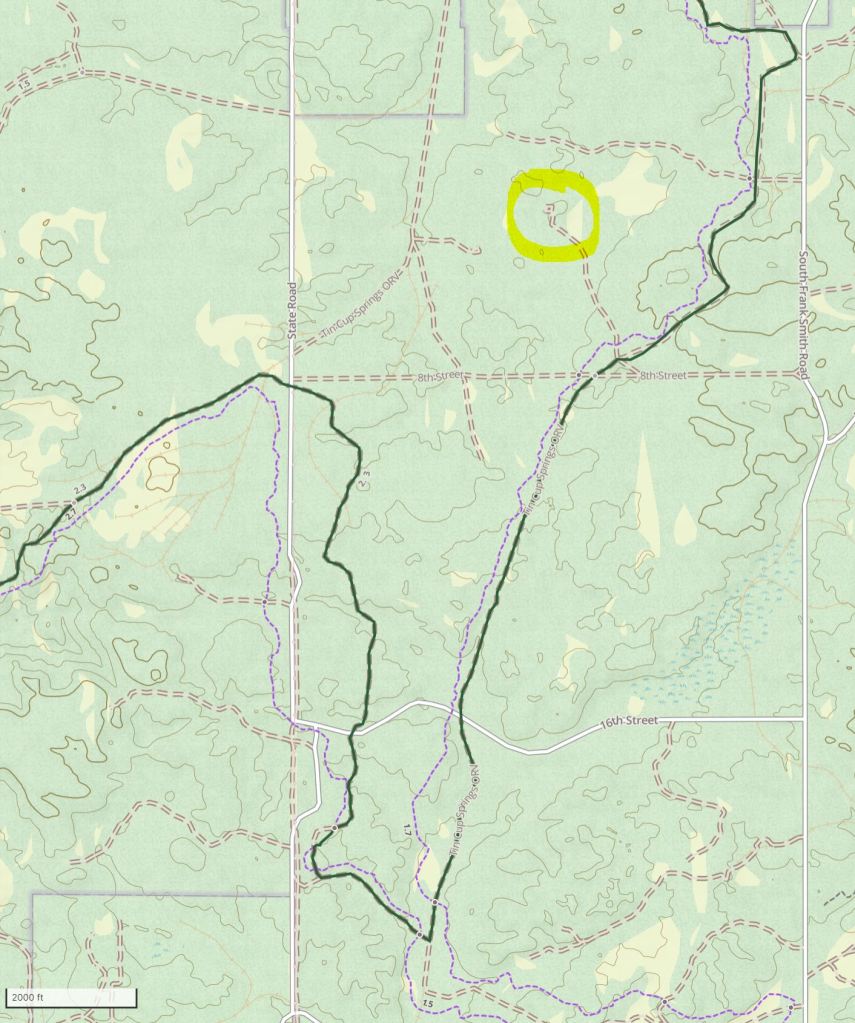 In the image above, I’ve circled the area I identified in advance as my preferred site to setup camp. This area was off the main trail and slightly elevated. Since distance contacts where going to be required I didn’t want to setup in a valley that might block lower RF take-off angles. Once I arrived here, I parked and surveyed the area. This entire area is heavily wooded so there was enough clear ground to setup camp but not much more.